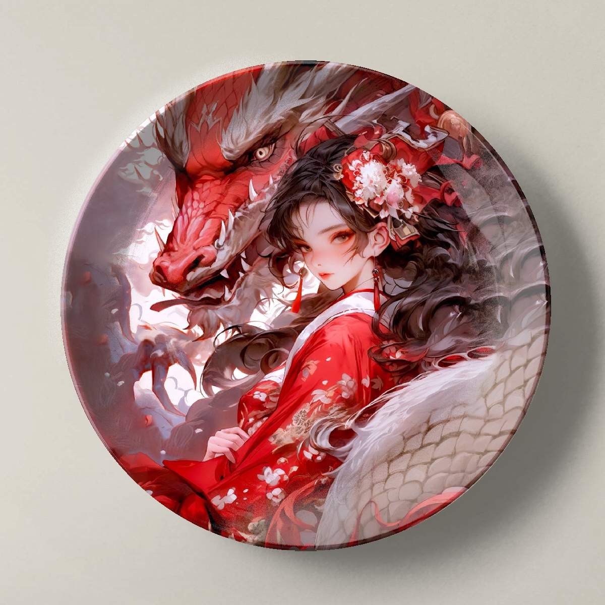 Красный дракон и девушка в красном цветочном платье